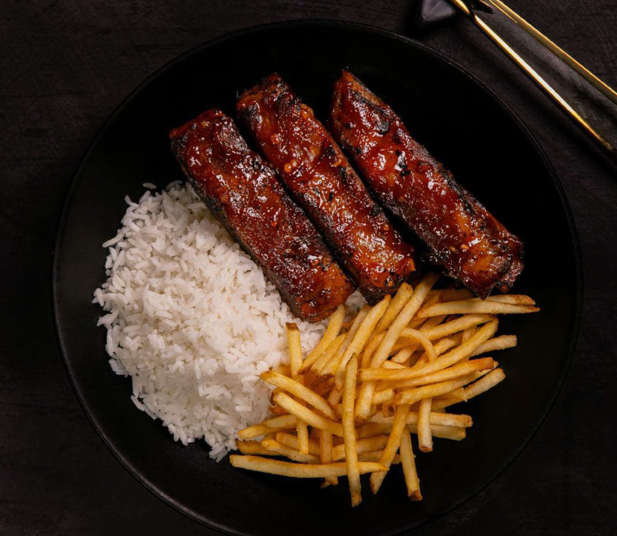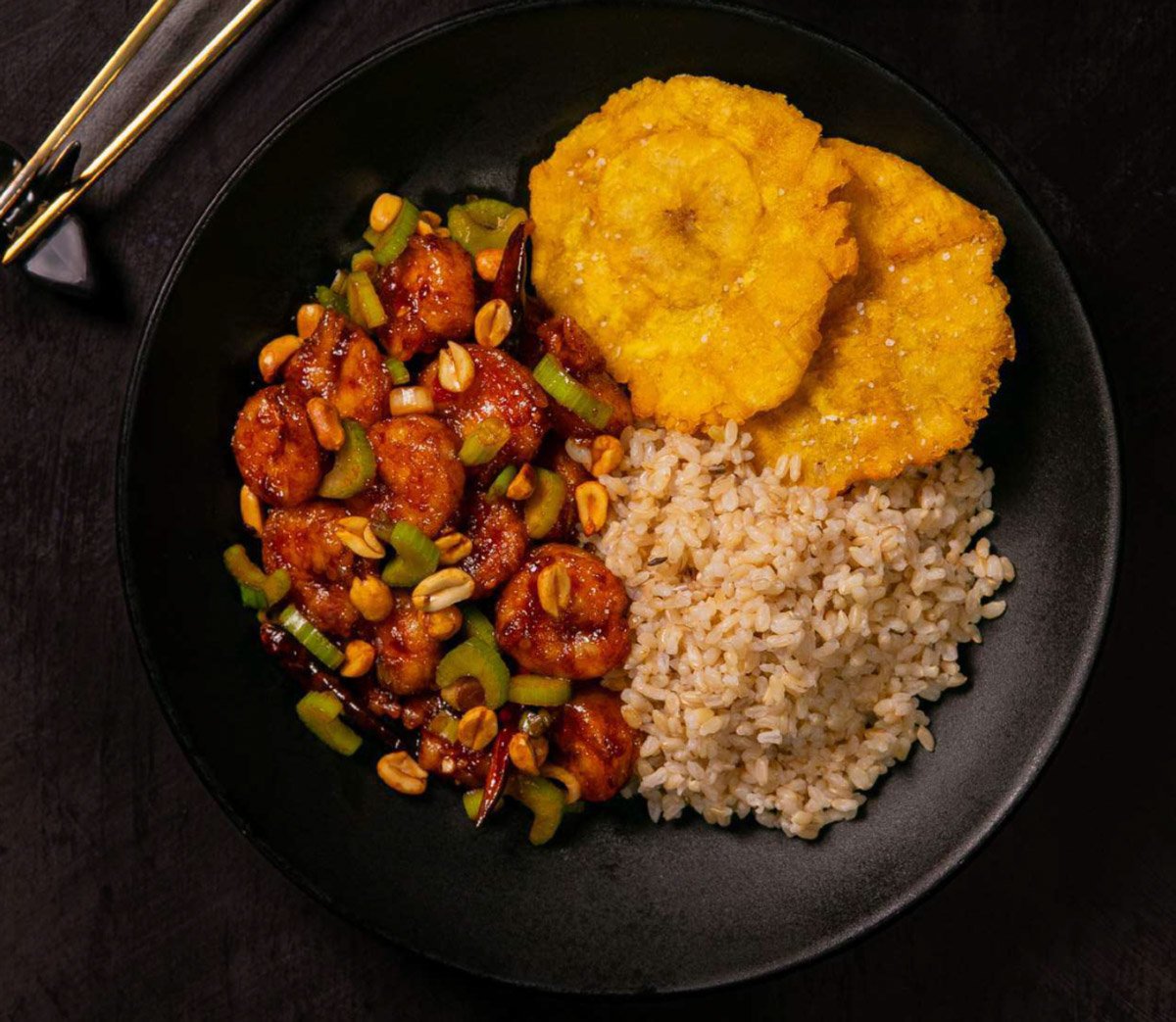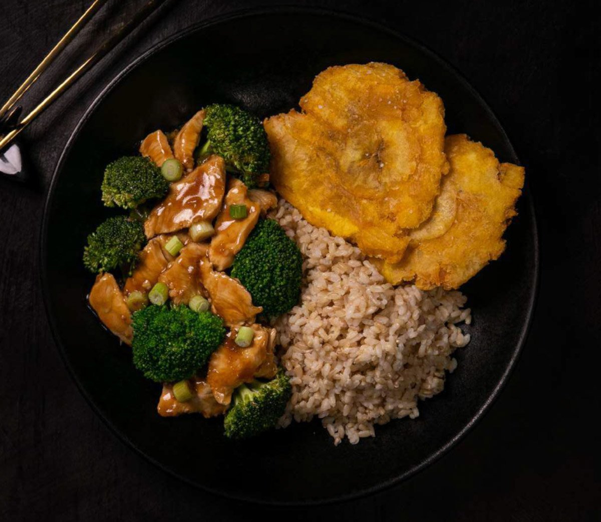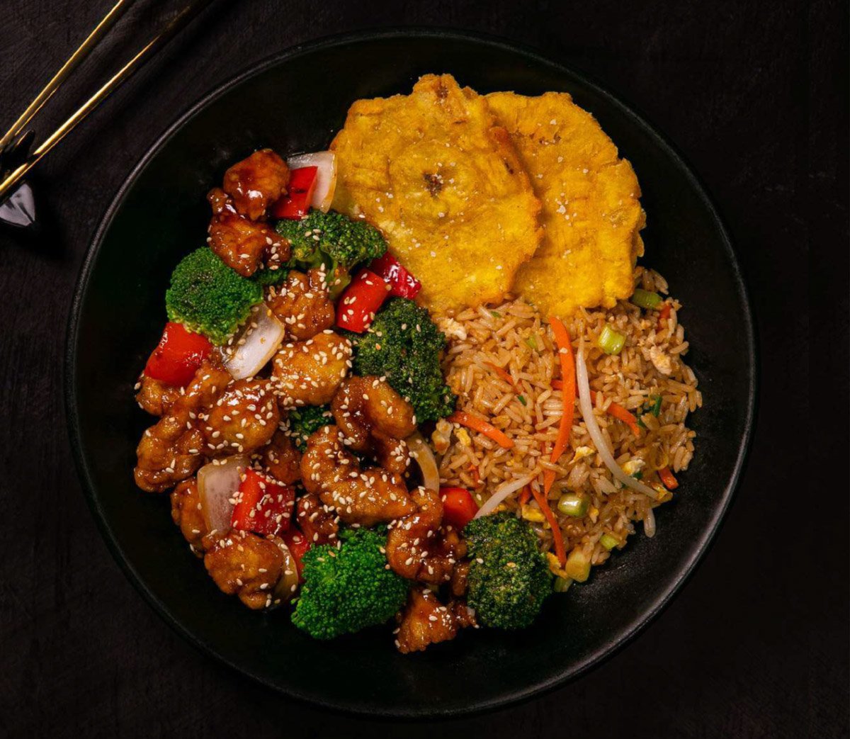 Todos los platos salen con un side de arroz: Blanco, integral o frito y un acompañante: papas fritas o tostones (+$1.00).